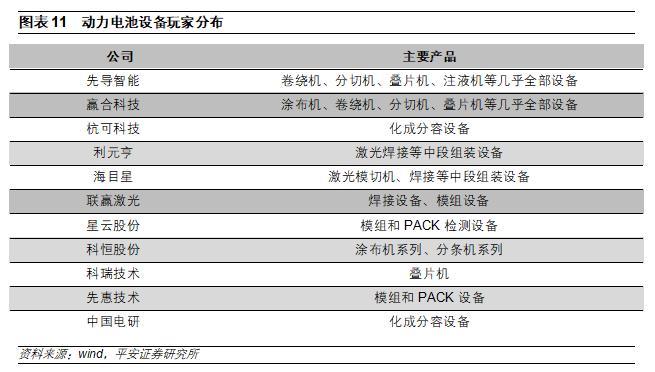 我國(guó)是全球最大的動(dòng)力電池生產(chǎn)基地,動(dòng)力電池設(shè)備廠(chǎng)家眾多。我國(guó)設(shè)備行業(yè)誕生了先導(dǎo)智能、贏合科技、杭可科技等龍頭企業(yè),同時(shí)還擁有利元亨、聯(lián)贏激光、海目星、中國(guó)電研等一批優(yōu)秀的二線(xiàn)品牌。