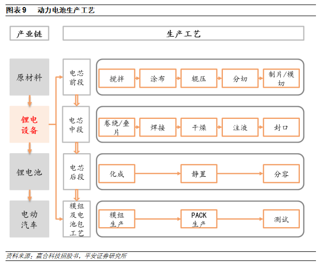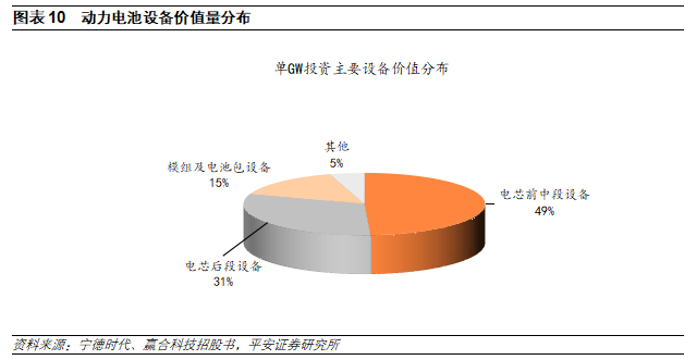 鋰電設(shè)備主要分為電芯前段、中段、后段、模組和PACK四大類(lèi)。動(dòng)力電池工藝流程主要包括電芯前段、電芯中段、電芯后段、模組及電池包段四大環(huán)節(jié)。其中前段的核心設(shè)備為涂布機(jī),中段核心設(shè)備為卷繞機(jī)/疊片機(jī),后段的核心設(shè)備為化成分容設(shè)備。設(shè)備價(jià)值分布方面,電芯前中段、電芯后段、模組及電池包、其他占比分別為49%、31%、15%和5%。