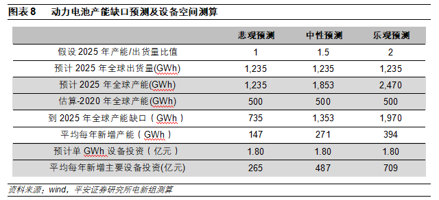 中性預(yù)期下,未來(lái)5年鋰電設(shè)備年均市場(chǎng)規(guī)模達(dá)487億元。由于動(dòng)力電池產(chǎn)能處于快速擴(kuò)張期,產(chǎn)能擴(kuò)張快于出貨量數(shù)據(jù),產(chǎn)能/出貨量通常大于1。我們按照2025年產(chǎn)能/出貨量為1(悲觀預(yù)期)、1.5(中性預(yù)期)、2(樂(lè)觀預(yù)期)來(lái)測(cè)算,則2025年全球動(dòng)力電池產(chǎn)能分別達(dá)到1235GWh、1853GWh、2470GWh.2020年,全球動(dòng)力電池產(chǎn)能預(yù)估為500GWh,則三種預(yù)期下,2020年到2025年全球動(dòng)力電池產(chǎn)能缺口分別為735GWh、1353GWh、1970GWh,年均新增產(chǎn)能為147GWh、271GWh、394GWh。按照每GWh設(shè)備投資為1.8億元測(cè)算,則三種預(yù)期下,年均設(shè)備市場(chǎng)空間分別為265億元、487億元、709億元。鋰電設(shè)備景氣度具有可持續(xù)性。