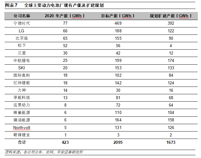 動(dòng)力電池企業(yè)進(jìn)入新一輪擴(kuò)張期。2020年,受疫情影響,新能源汽車(chē)和動(dòng)力電池裝機(jī)量出現(xiàn)下滑,產(chǎn)業(yè)鏈擴(kuò)產(chǎn)不積極。2021年以來(lái),由于新能源汽車(chē)月度數(shù)據(jù)持續(xù)超預(yù)期,動(dòng)力電池企業(yè)新簽訂單飽滿(mǎn)。為了承接爆發(fā)增長(zhǎng)的需求,動(dòng)力電池企業(yè)開(kāi)始加速新一輪擴(kuò)張。截至2020年底,全球主要?jiǎng)恿﹄姵仄髽I(yè)合計(jì)產(chǎn)能超420GWh,總的擴(kuò)產(chǎn)規(guī)劃超過(guò)1600GWh。