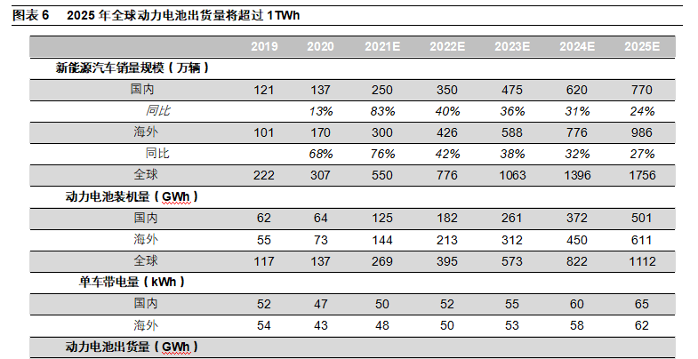 動(dòng)力電池將迎來(lái)TWh時(shí)代。根據(jù)平安證券電力設(shè)備與新能源組預(yù)測(cè)數(shù)據(jù),2021年全球新能源汽車(chē)銷(xiāo)量將達(dá)到550萬(wàn)輛,同比增長(zhǎng)79%。其中,國(guó)內(nèi)銷(xiāo)量預(yù)計(jì)達(dá)到250萬(wàn)輛,同比增長(zhǎng)83%。預(yù)計(jì)到2025年,國(guó)內(nèi)、國(guó)外新能源汽車(chē)銷(xiāo)量分別達(dá)到770萬(wàn)輛、986萬(wàn)輛,按照國(guó)內(nèi)單車(chē)帶電量65kWh,國(guó)外單車(chē)帶電量62kWh測(cè)算,預(yù)計(jì)2025年國(guó)內(nèi)和國(guó)外裝機(jī)量分別達(dá)到501GWh和611WGh,合計(jì)達(dá)到1112GWh。我們按照裝機(jī)量/出貨量為90%估算,到2025年,全球動(dòng)力電池出貨量將達(dá)到1235GWh。動(dòng)力電池將進(jìn)入TWh時(shí)代。