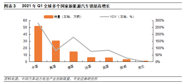 不僅僅是國(guó)內(nèi)銷(xiāo)量超預(yù)期,海外新能源汽車(chē)銷(xiāo)售同樣景氣。2021年Q1,美國(guó)、德國(guó)、法國(guó)、英國(guó)、挪威等國(guó)新能源汽車(chē)銷(xiāo)量分別為30.37萬(wàn)輛、14.27萬(wàn)輛、6.19萬(wàn)輛、5.83萬(wàn)輛、2.97萬(wàn)輛,同比增速達(dá)81%、178%、75%、83%、27%。全球新能源汽車(chē)銷(xiāo)量同樣在加速。
