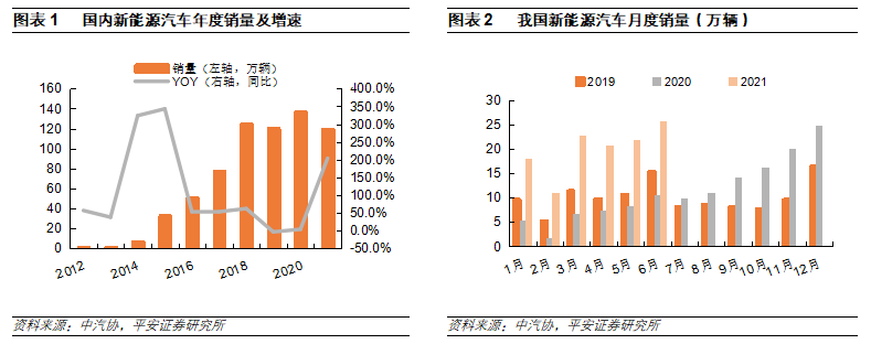2021年新能源汽車(chē)銷(xiāo)量爆發(fā)增長(zhǎng)。2021年H1,國(guó)內(nèi)新能源汽車(chē)總銷(xiāo)量達(dá)119萬(wàn)輛,同比增長(zhǎng)204%,相比2019年H1也上漲了91%,新能源汽車(chē)銷(xiāo)量數(shù)據(jù)超出市場(chǎng)預(yù)期。從月銷(xiāo)量數(shù)量來(lái)看,2021年1-6月,我國(guó)新能源汽車(chē)單月銷(xiāo)量分別為17.9萬(wàn)輛、11.0萬(wàn)輛、22.6萬(wàn)輛、20.6萬(wàn)輛、21.7萬(wàn)輛、25.6萬(wàn)輛,同比增速均超過(guò)100%。