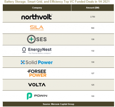 電池廠商和儲(chǔ)能廠商主導(dǎo)著企業(yè)融資的格局。下圖是2021年上半年的主要交易,包括電池儲(chǔ)能系統(tǒng)、智能電網(wǎng)和能源效率的廠商,但名列前茅的交易都是電池廠商和儲(chǔ)能廠商。