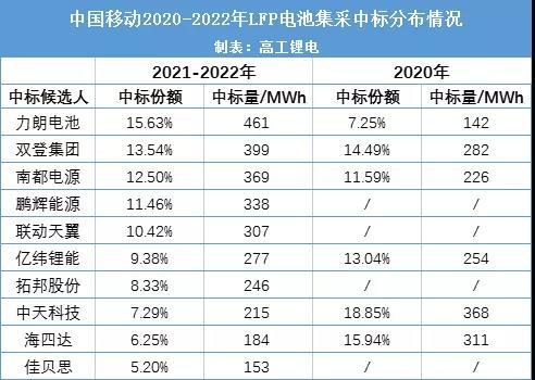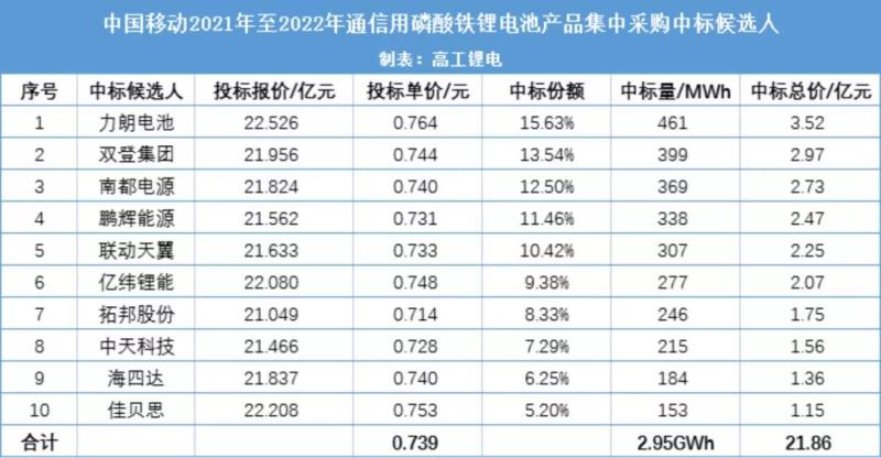 7月13日,中國(guó)移動(dòng)公示2021年至2022年通信用磷酸鐵鋰電池產(chǎn)品集中采購(gòu)中標(biāo)候選人,力朗電池、雙登集團(tuán)、南都電源、鵬輝能源、聯(lián)動(dòng)天翼、億緯鋰能、拓邦股份、中天科技、海四達(dá)、佳貝思這10家企業(yè)中標(biāo)。