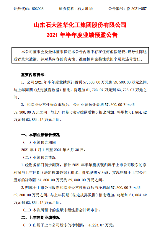 7月14日收盤(pán)后,石大勝華發(fā)布2021年中期業(yè)績(jī)預(yù)告,預(yù)計(jì)上半年盈利5.75億元-5.95億元,上年同期虧損4223萬(wàn)元。