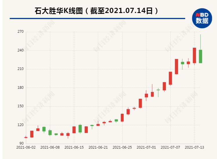 鋰電池巨頭寧德時(shí)代花了整整兩年的時(shí)間從67.9元/股走到560元/股,翻了將近7倍。但有一只“妖股”石大勝華僅用了一年時(shí)間就“獲得這樣的成就”,行情統(tǒng)計(jì)顯示,從2020年6月30日至今,股價(jià)從23.66元/股飆漲到今日最高的265元/股,期間最高漲幅超1000%。