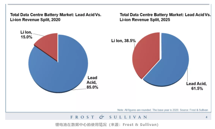Frost & Sullivan分析認(rèn)為,2020年,鋰離子電池占全球數(shù)據(jù)中心電池市場的15%,但隨著鋰離子電池在數(shù)據(jù)中心應(yīng)用的不斷增加,預(yù)計到2025年,這一比例將顯著上升至38.5%。