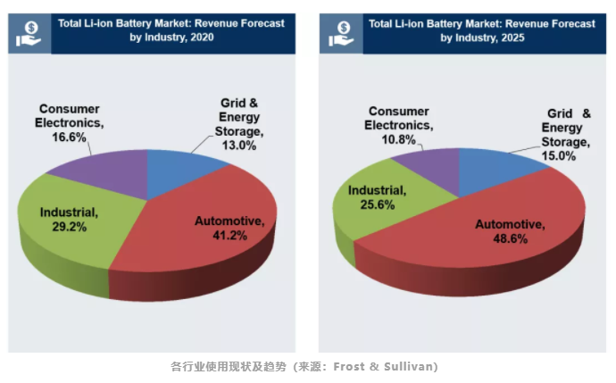 包括工業(yè)、電網(wǎng)和儲能、汽車和消費(fèi)電子產(chǎn)品等數(shù)據(jù)中心細(xì)分行業(yè)將越來越多地使用鋰離子電池。其中,隨著清潔能源技術(shù)的日益采用,以及對儲能系統(tǒng)(ESS)的需求不斷增長,預(yù)計將使儲能應(yīng)用在總市場中的總體貢獻(xiàn)從2020年的13%提高到2025年的15%。