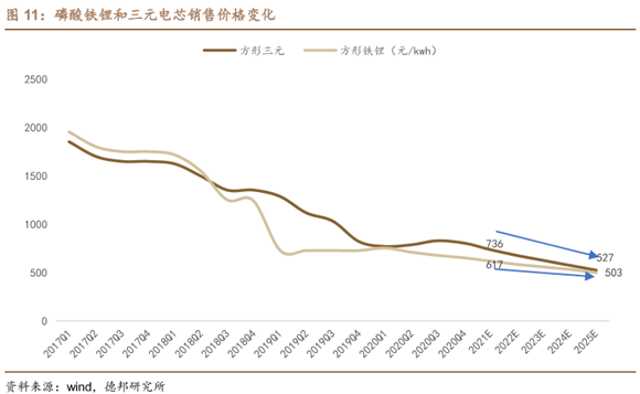 德邦證券預測,到2025年,磷酸鐵鋰和三元電芯的銷售價格差距將從20%縮窄至5%,有望實現(xiàn)三元平價。