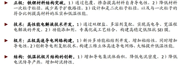 由于磷酸鐵鋰作為正極材料的導電性較差,低溫環(huán)境下容易產(chǎn)生極化,從而降低電池容量,此外電池內(nèi)的負極石墨也會受到低溫影響,嵌鋰速度降低,表面析出金屬鋰,充電后馬上就用則不夠安全;還有電解液在低溫下會增加黏度,鋰離子遷移阻抗也會隨著增大;還有粘接劑問題……