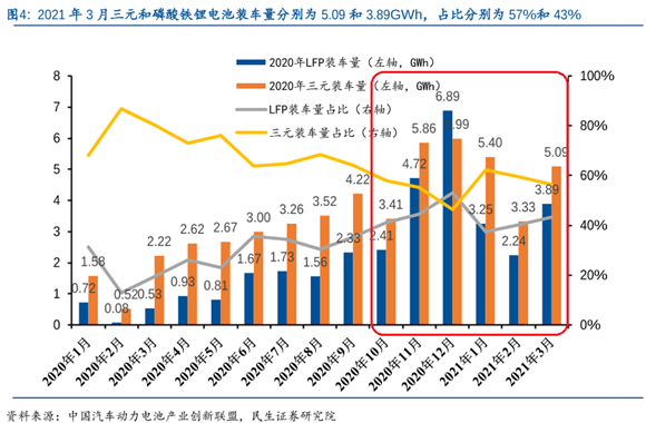 從鐵鋰和三元的裝車量占比看,兩者已經(jīng)不相上下,2021年3月,兩類電池的裝車量分別達到3.89GWh和5.09GWh,占比分別為43%和57%,兩者的剪刀口縮窄至14%。