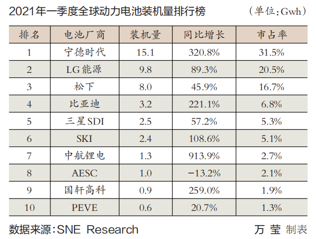 當(dāng)前,全球動(dòng)力電池市場(chǎng)呈現(xiàn)以中國(guó)的寧德時(shí)代、韓國(guó)的LG化學(xué)和日本的松下占據(jù)主導(dǎo)地位的局面,即中日韓“三國(guó)殺”的格局。今年一季度,寧德時(shí)代以絕對(duì)領(lǐng)先優(yōu)勢(shì)衛(wèi)冕全球最大動(dòng)力電池廠商的寶座,裝機(jī)量同比大漲320.8%,達(dá)到15.1Gwh,市占率高達(dá)31.5%;緊隨其后的是韓國(guó)電動(dòng)力電池巨頭——LG能源,裝機(jī)量同比增長(zhǎng)89.3%,達(dá)到9.8Gwh,市占率為20.5%;松下位居第三,裝機(jī)量同比增長(zhǎng)45.9%,達(dá)到8Gwh,市占率為16.7%。