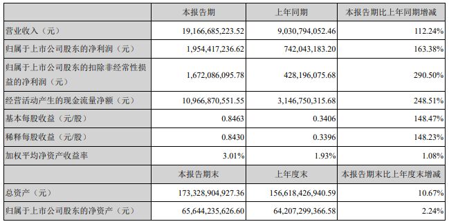 4月29日晚,寧德時代發(fā)布2021年第一季度報告。報告顯示,寧德時代一季度實現(xiàn)營業(yè)收入191.67億元,同比增長112.24%;歸屬于上市公司股東的凈利潤達(dá)19.54億元,同比增長163.38%。