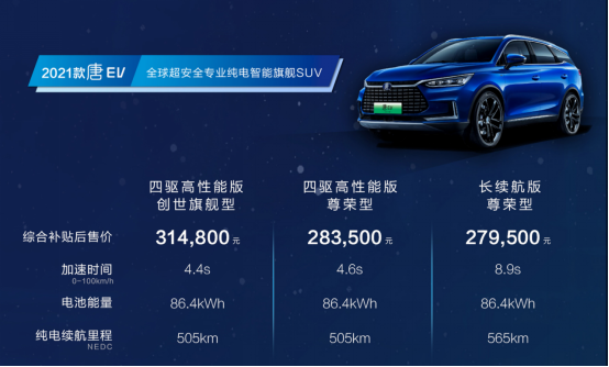 2021款唐EV、秦PLUS EV、宋PLUS EV及2021款e2四款純電車型全面切換搭載刀片電池上市發(fā)布。其中2021款唐EV綜合補貼后價格為27.95萬元-31.48萬元,秦PLUS EV綜合補貼后價格為12.98萬元-16.68萬元,宋PLUS EV綜合補貼后價格為16.98萬元-18.68萬元,2021款e2綜合補貼后價格為9.98萬元-11.58萬元。