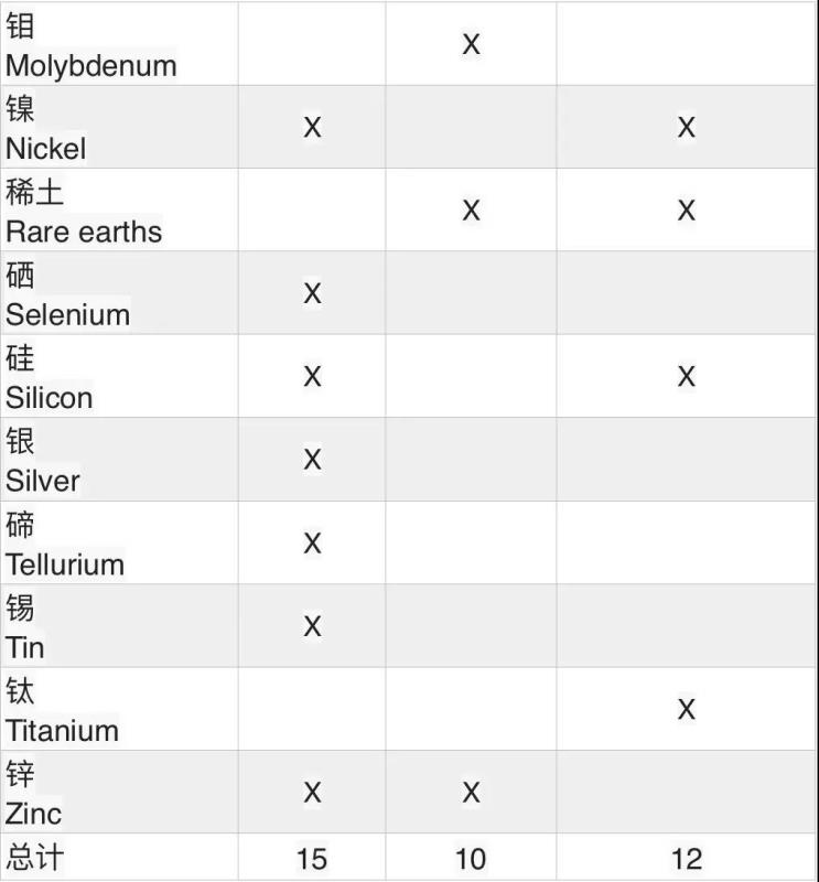 總結(jié)一下,太陽(yáng)能技術(shù)對(duì)于各種金屬材料依賴較大(15種);其次是電動(dòng)汽車(chē)/儲(chǔ)能(12種)、風(fēng)能(10種)。也就是說(shuō),太陽(yáng)能、儲(chǔ)能相關(guān)技術(shù)對(duì)于金屬材料的依賴使得其較受地理政治(金屬材料資源分布)的影響,風(fēng)能技術(shù)受地理政治影響相對(duì)比較小。