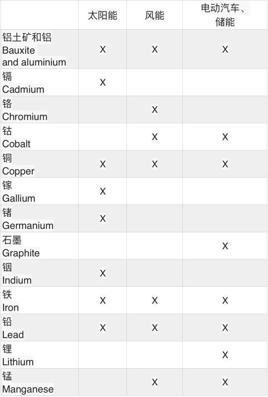 全球能源轉(zhuǎn)型地緣政治委員會(huì)(Global Commission on the Geopolitics of Energy Transformation)與國(guó)際可再生能源署(IRENA)日前發(fā)布《一個(gè)新世界:能源轉(zhuǎn)型的地理政治》(A New World: The Geopolitics of the Energy Transformation),其中轉(zhuǎn)引了一張表列出綠色能源技術(shù)所需要的各類金屬材料——