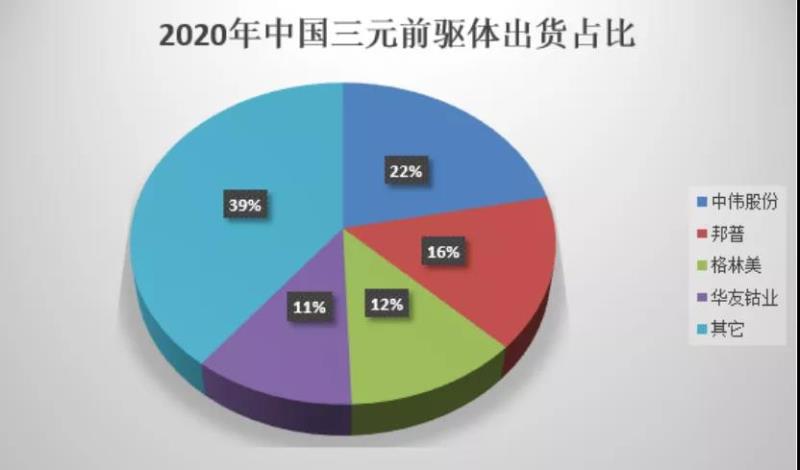 從市場(chǎng)競爭格局來看,2020年國內(nèi)三元前驅(qū)體出貨量TOP4企業(yè)排名,從2019年的格林美、中偉股份、邦普、華友鈷業(yè)變成中偉股份、邦普、格林美、華友鈷業(yè)。
