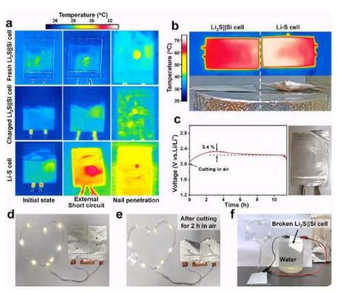 基于硫化鋰正極、硅負(fù)極與聚合物凝膠電解質(zhì)的準(zhǔn)固態(tài)鋰二次電池在(a)內(nèi)、外部短路、(b)過(guò)熱、(c)剪切后空氣靜置、(d)穿刺、(e)剪切暴露空氣、(f)剪切浸水等濫用條件下的安全性評(píng)估