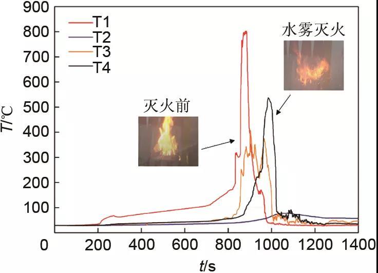 如圖10所示,從t=780 s著火開始至t=998 s水霧啟動(dòng),整個(gè)預(yù)燃燒時(shí)長(zhǎng)為218 s,開啟水霧滅火后,T3、T4處溫度迅速降低,連續(xù)噴霧30 s后,溫度降低到100 ℃以下,停止噴霧后,沒有發(fā)生復(fù)燃現(xiàn)象。實(shí)驗(yàn)結(jié)果表明水霧能很好地抑火降溫,并有效防止復(fù)燃。相比于氣體滅火,水霧或許是一種很好的滅火介質(zhì),能持續(xù)對(duì)著火的鋰電池降溫,但同時(shí)也應(yīng)注意在實(shí)際應(yīng)用中水霧產(chǎn)生的水漬可能會(huì)造成大面積的設(shè)備損壞,產(chǎn)生二次破壞,而且霧滴直徑過大的水霧還可能會(huì)導(dǎo)致電池組短路或放電,加劇熱失控及火災(zāi)規(guī)模的增長(zhǎng),因此具體的滅火方式選擇需要根據(jù)滅火對(duì)象進(jìn)行具體分析。而這些具體應(yīng)用的基礎(chǔ)是實(shí)驗(yàn)數(shù)據(jù),因此非常有必要進(jìn)一步開展更大尺寸,特別是全尺寸的滅火實(shí)驗(yàn),研究鋰電池組的燃燒特性和檢驗(yàn)不同滅火方式的有效性。