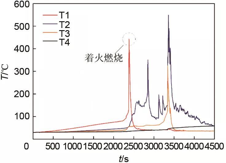然而,如表2所示,著火時(shí),T1的溫度相比功率更小的工況并沒有顯著差異,而是介于120~139 ℃。此外,工況3中T2、T3、T4三處位置的溫度相比加熱功率為1 kW時(shí)更低,這或許表明鋰電池組在外界輻射熱作用下,只有當(dāng)溫度上升到某個(gè)特定范圍后,才會(huì)產(chǎn)生著火燃燒的現(xiàn)象,此處需要指出的是表2中列出的著火溫度由于采集點(diǎn)有限,可能并不是獲取的最低著火溫度。盡管如此,可以在一定程度上說明通過電池管理系統(tǒng)對(duì)每個(gè)電池芯的溫升變化進(jìn)行實(shí)時(shí)監(jiān)測(cè)是非常必要的,通過設(shè)置溫度閾值,一旦鋰電池組局部溫升超過該值,就啟動(dòng)預(yù)警和防控措施,阻止整個(gè)電池組由于熱失控導(dǎo)致火災(zāi)發(fā)生。