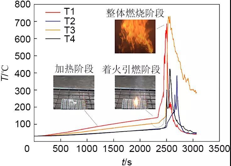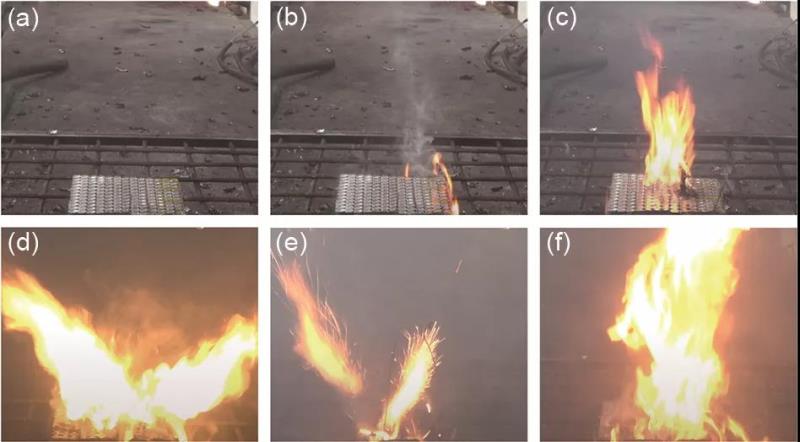(2)著火階段。實(shí)驗(yàn)中觀察到,電池在著火前會(huì)產(chǎn)生大量煙氣,這些煙氣中含有許多可燃物,包括從電池內(nèi)部反應(yīng)產(chǎn)生的,也有電池組外殼包裝材料受熱解產(chǎn)生的,熱量集聚到一定程度后,發(fā)生著火,如圖5(b)所示。
