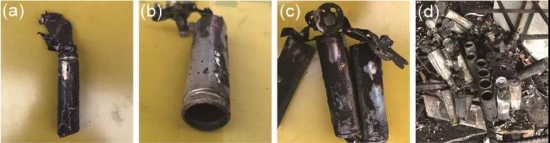 鋰離子電池組燃燒后的幾個(gè)典型形態(tài)如圖7所示,鋰電池芯在使用時(shí)會(huì)通過串并聯(lián)的方式連接起來,組成電池組,通過電池管理系統(tǒng)(BMS)對(duì)各個(gè)電池芯進(jìn)行智能化管理。電池組在受到外加輻射熱源被引燃后,會(huì)發(fā)生爆炸式的劇烈燃燒,部分電池芯會(huì)在內(nèi)部反應(yīng)產(chǎn)生的氣壓作用下脫離電池組,四處飛濺,內(nèi)部隔膜材料也會(huì)溢出,如圖7(a)所示。由于電池芯正極安全閥的設(shè)計(jì),當(dāng)內(nèi)部化學(xué)反應(yīng)產(chǎn)生氣體后,壓力會(huì)通過安全閥外泄,從而降低了因?yàn)閮?nèi)壓造成電池芯外壁面破損的風(fēng)險(xiǎn),如圖7(b)所示。對(duì)于一個(gè)鋰電池組,若其中一個(gè)電池發(fā)生熱失控著火或者因?yàn)橥庖驅(qū)е轮鸷?,其周圍的鋰電池芯?huì)受到壁面?zhèn)鳠?,或者噴射出來的高溫殘留物灼燒,或者明火產(chǎn)生的熱輻射等方式引燃周圍電池芯,進(jìn)一步擴(kuò)大著火面積,而不會(huì)因?yàn)楸诿姹ㄋ查g擴(kuò)大火勢(shì),這說明相比鋰電池組側(cè)面,其底部(負(fù)極)需要被更好地防火保護(hù)。在過熱條件下鋰電池組的燃燒蔓延過程,首先發(fā)生變化的是電池溫度,通過測(cè)量電池組內(nèi)部溫度的變化和分布情況,可以定量地分析鋰電池組火災(zāi)行為,這對(duì)于如何去更好的控制火勢(shì)以及研發(fā)新的高效滅火技術(shù)有重要意義。