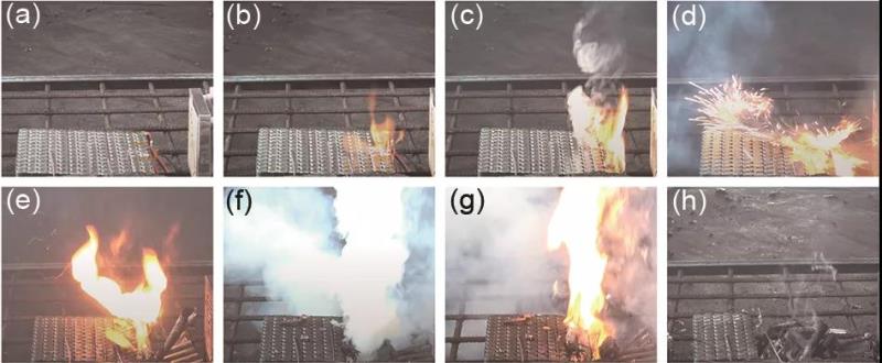 如圖6(a)所示,通過外加輻射熱源的方式對(duì)鋰電池組側(cè)面加熱,持續(xù)一段時(shí)間后,電池組距離熱源最近的一列電池最先著火,如圖6(b)所示,然后從右向左燃燒蔓延,在高溫火焰附近的電池芯安全閥被沖開,產(chǎn)生白色煙氣,如圖6(c)所示,同時(shí)伴隨著火花四濺的現(xiàn)象,如圖6(d)所示,這表示電池芯內(nèi)部的電解液被噴出。電池組表面火焰在蔓延過程中逐漸熄滅,此時(shí)未著火的電池內(nèi)部仍然在劇烈反應(yīng),此時(shí)可以觀察到大量白煙產(chǎn)生,如圖6(f)所示,這是電池芯內(nèi)部反應(yīng)產(chǎn)生的氣體,當(dāng)遇到高溫或火花或具有類似點(diǎn)火能量時(shí),電池出現(xiàn)復(fù)燃,如圖6(g)所示,直至火焰完全熄滅,從試驗(yàn)結(jié)果可以看到,當(dāng)鋰電池組側(cè)面過熱時(shí),電池燃燒劇烈程度會(huì)隨著距離的增加而逐漸減弱,同時(shí)會(huì)多次出現(xiàn)斷續(xù)復(fù)燃的現(xiàn)象。