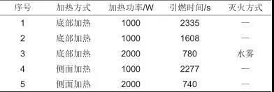 共開展5組實(shí)驗(yàn),工況見表1。實(shí)驗(yàn)1~3的加熱方式為底部加熱,4和5采用側(cè)面加熱,主要用于研究不同加熱位置對(duì)鋰電池組燃燒蔓延特性的影響。在此基礎(chǔ)上,開展了1組滅火實(shí)驗(yàn),即實(shí)驗(yàn)3,采用的方式為水霧滅火。實(shí)驗(yàn)1和2是均采用底部加熱方式重復(fù)實(shí)驗(yàn)。此外,實(shí)驗(yàn)3和實(shí)驗(yàn)5加熱功率相比其他3組更高,為2 kW,用于研究外部熱源功率增大條件下鋰電池組內(nèi)部溫度及燃燒特性的變化規(guī)律。