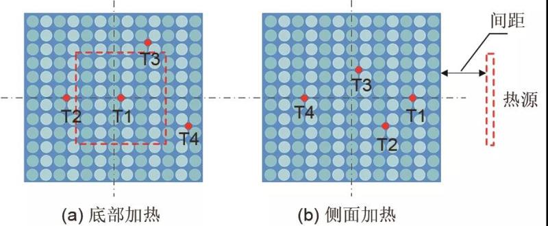實(shí)驗(yàn)中,在電池組內(nèi)部布置4根K型鎧裝熱電偶(T1、T2、T3、T4),熱電偶直徑1 mm,熱電偶位于電池芯中間位置,距離底部30 mm,用于采集電池組不同位置的溫度變化情況,但對(duì)于底部加熱和側(cè)面加熱兩種方式,熱電偶的布置位置并不相同,如圖4所示,紅色虛線框表示外加熱源(電熱爐)。此外在正面設(shè)置一個(gè)高清攝像機(jī),記錄電池組的燃燒蔓延過程。