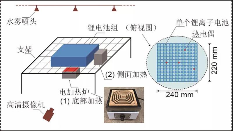將鋰電池組水平放置在一個(gè)支架上,電池正極朝上,如圖3所示。支架為網(wǎng)狀結(jié)構(gòu),可方便從電池底部進(jìn)行加熱。實(shí)驗(yàn)中采用兩種加熱方式:①電加熱爐位于鋰電池組底部,電熱爐加熱面與電池底面相距8 cm,對(duì)電池芯底面負(fù)極進(jìn)行持續(xù)加熱;②電加熱爐位于鋰電池側(cè)面,相距8 cm,對(duì)電池側(cè)面進(jìn)行持續(xù)加熱。電加熱爐有效加熱面長(zhǎng)12 cm,寬12 cm,面積144 cm2,加熱功率0~2000 W可調(diào)。采用外部熱源加熱鋰電池組,引發(fā)著火的流程是:打開電熱爐進(jìn)行持續(xù)加熱,直至鋰電池著火后關(guān)閉電源,停止加熱。