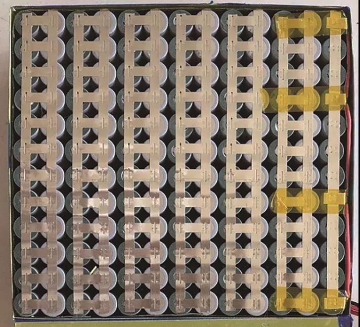 本文采用三元鋰離子電池組作為研究對(duì)象,電池組長(zhǎng)240 mm、寬220 mm、高85 mm,重量為7 kg。電池組正常工作時(shí)電壓為48 V,額定容量30 A·h,內(nèi)部由156(12×13)個(gè)標(biāo)準(zhǔn)18650電池芯組成,單個(gè)電芯高65 mm,直徑最大18.4 mm,如圖1所示。試驗(yàn)前,將電池組外包裝拆除,因?yàn)橥獍b為阻燃材料,通過外部加熱無法引燃鋰電池。此外,內(nèi)部電路及電池管理系統(tǒng)保持不變,電池荷電狀態(tài)(SOC)均為100%。