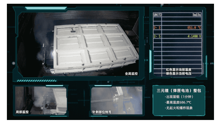 在“彈匣電池”針刺實驗中,采用了最嚴苛的標準進行了測試,電池包被刺穿后溫度快速提升至686度左右就開始回落,電壓開始下降,損傷處有白色煙霧產(chǎn)生,但無起火甚至爆炸現(xiàn)象產(chǎn)生。