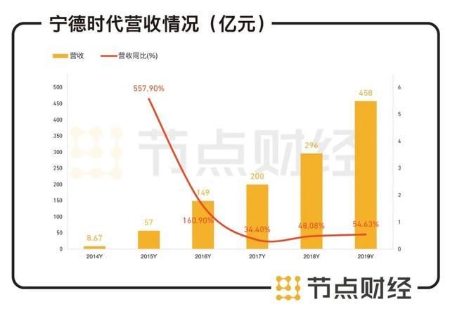 2018年6月,寧德時(shí)代成功登陸創(chuàng)業(yè)板,市值很快超過中國最大車企上汽集團(tuán)。到2019年,寧德時(shí)代營收同比增長54.63%至458億元,市場(chǎng)份額在當(dāng)年三季度創(chuàng)下63.58%新高,成了行業(yè)“寡頭”。
