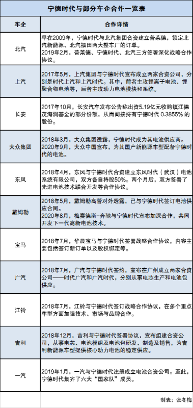 在中國新能源汽車動力電池市場,寧德時代可謂是一家獨大,2020年裝機量在國內(nèi)所占份額高達52%。也正是由于其強勢的市場地位,在給主機廠供貨時話語權較大,可以“挑”。為此,上汽、東風、寶馬、廣汽、江鈴、吉利等多家國內(nèi)外主機廠選擇與寧德時代加深合作,從而確保獲得電池供應的優(yōu)先權。