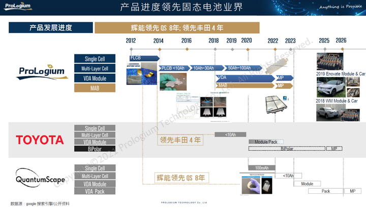 跟競爭對手相比,我們在2016年就已經(jīng)有試產(chǎn)線建成,比TOYOTA領(lǐng)先了六年,領(lǐng)先了QuantumScape7年。我們在內(nèi)地有2GWh建制的計(jì)劃,在最近這一兩個(gè)月里大家就可以聽到我們進(jìn)一步的好消息,接下來明年就會(huì)有2GWh的工廠建成并預(yù)計(jì)于2023年擴(kuò)產(chǎn)至7GWh的產(chǎn)能。在產(chǎn)品的部分Quantumscape今年提出了100毫安培的產(chǎn)品,我們在2012年就有了,所以說從產(chǎn)品建設(shè)方面來看我們也是領(lǐng)先Quantumscape8年多的時(shí)間,而Quantumscape目前只有single layer技術(shù),但我們的multilayer我們已經(jīng)成功在市面上使用,然后又取得了安規(guī)認(rèn)證,再加上我們甚至也可以把這個(gè)pouch電池應(yīng)用到VDA上面也可以。整個(gè)產(chǎn)品經(jīng)過7年在市場上面的驗(yàn)證,所以在產(chǎn)品的成熟度上都是相較于其他固態(tài)電池要成熟,也因?yàn)檫@樣我們也獲得了國際的肯定,包括愛迪生獎(jiǎng)以及美國CES創(chuàng)新發(fā)明獎(jiǎng)。