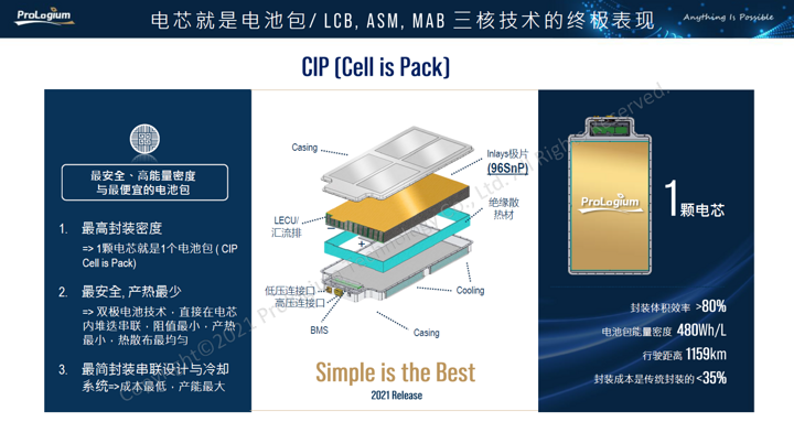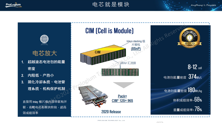 另外一個(gè)我們想做的是CIP,因?yàn)槲覀冊?019年把CIM成功做出來并且取得美國愛迪生的金獎(jiǎng),我們有很大信心把CIM變成CIP(cell is pack)電池包,在電芯和電池包的部分同步提升能量密度還有續(xù)航里程和CIP這樣的設(shè)計(jì),在成本的部分我們可以極簡冷卻系統(tǒng)封裝、BMS的管理系統(tǒng),節(jié)省出很多模組工藝制程,我們直接拿極片堆疊成一電池包,他基本上通過這個(gè)方式讓內(nèi)阻降到很低,冷卻系統(tǒng)也會(huì)變得很簡單,成本也會(huì)隨之大幅下降。我們估算了一下,當(dāng)我們整個(gè)產(chǎn)能達(dá)到7GWh的時(shí)候搭配上CIP技術(shù),成本即可相當(dāng)于NCM622的成本,當(dāng)我們把整個(gè)產(chǎn)能再往上提升到15GWh的時(shí)候搭配上CIP技術(shù),成本即可跟811相當(dāng),這也是我們希望CIP固態(tài)電池能夠做到的終極目標(biāo)。