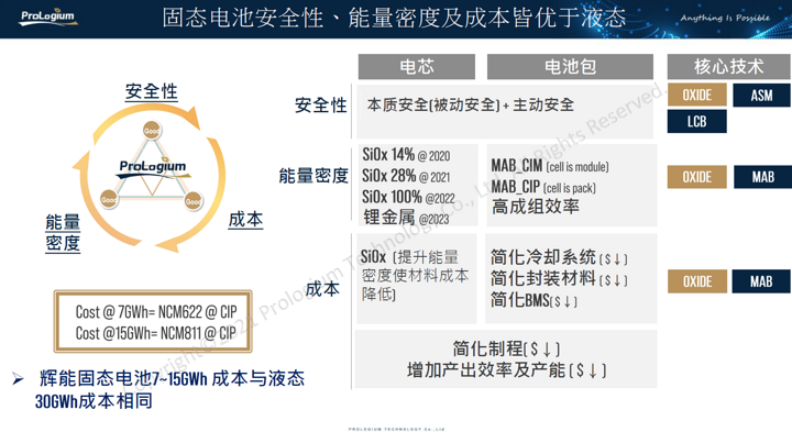 如果要從液態(tài)膠態(tài)進(jìn)展到固態(tài)有一個(gè)很大的差異,我們從圓柱到角柱都有30%工藝上的差異,那從軟包再到固態(tài)電池又有60%以上工藝制備上的差異,所以說在這樣的理解之下我們來看自己的固態(tài)電池,有三個(gè)點(diǎn)是非常重要的,也是最基礎(chǔ)的,就是安全性、能量密度還有成本。在安全性部分,因?yàn)槲覀冇玫氖茄趸锕虘B(tài)電解質(zhì),是所有固態(tài)電解質(zhì)中最穩(wěn)定的系統(tǒng),我們就可以不斷使用高活性的材料提升能量密度,然后降低電芯成本。