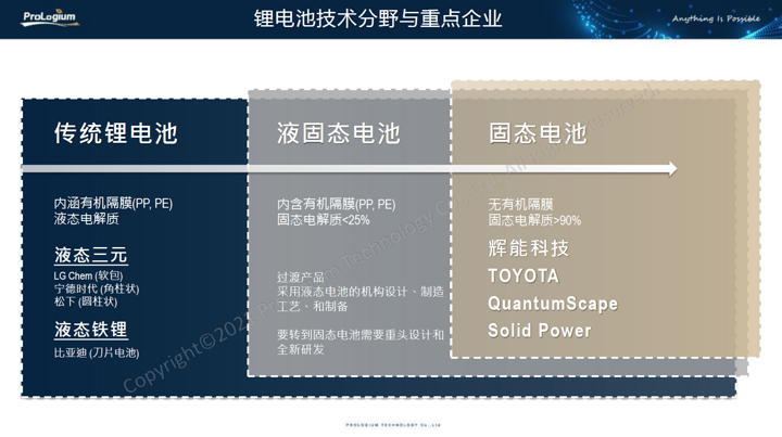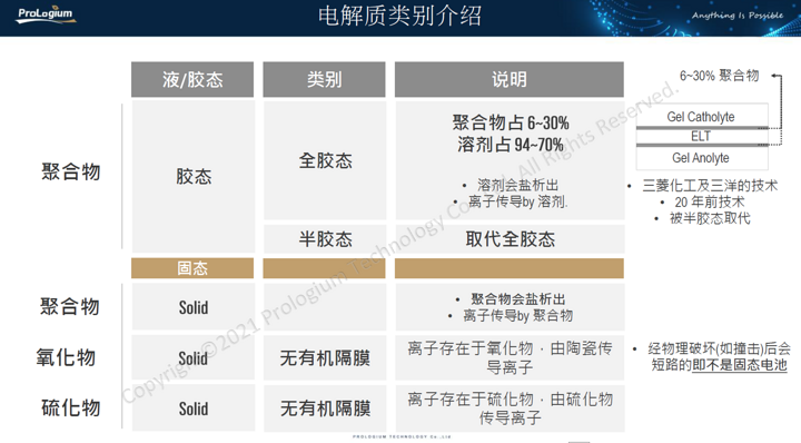相較于傳統(tǒng)鋰電池和液固態(tài)電池,固態(tài)電池有90%以上都是固態(tài)電解質(zhì),剩下1~10%可能就是在其他極層部分有其他混合或者是全固態(tài)都是屬于這個(gè)領(lǐng)域里面的。在這個(gè)固態(tài)電解質(zhì)大于90%的固態(tài)電池里面,前幾大都是這幾個(gè)主要的代表之一。相較于這兩種之外,還有一種是介于中間的過渡性產(chǎn)品,它是基于液態(tài)電池的架構(gòu)做的一個(gè)改良,其固態(tài)電解質(zhì)小于25%。如果從整個(gè)電解質(zhì)的角度去做分類可以看到,聚合物、氧化物還有硫化物三種,所以基本上要分膠態(tài)跟液態(tài)有一個(gè)簡單的點(diǎn),我們?nèi)タ此}類分解的部分到底是因?yàn)槿軇﹩?dòng)的還是聚合物啟動(dòng),如果從溶劑啟動(dòng)就是膠態(tài),如果是聚合物啟動(dòng)那就是固態(tài)。另外離子移動(dòng)的部分也是一樣,如果是溶劑驅(qū)動(dòng)就是膠態(tài),全膠態(tài)的技術(shù)在20年前被半膠態(tài)給取代。