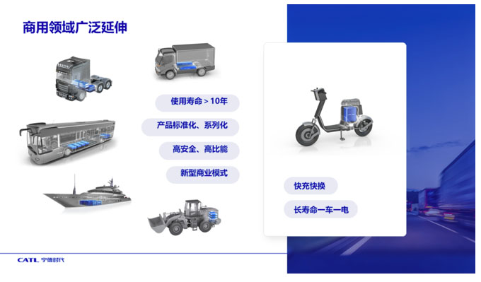 商用領(lǐng)域多數(shù)是生產(chǎn)工具,車型復(fù)雜多變。針對這一需求,我們開發(fā)了長壽命電池,保證高強(qiáng)度運營的質(zhì)保需要。標(biāo)準(zhǔn)化、系列化設(shè)計的電池包有效提高通用性。和產(chǎn)業(yè)鏈合作伙伴共同推出了車電分離、電池或整車租賃等新型商業(yè)模式。