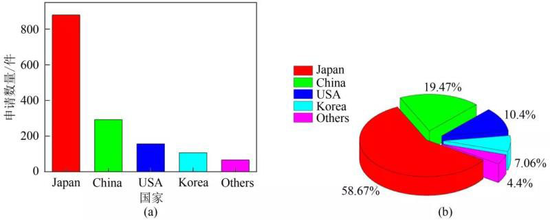 對專利申請優(yōu)先權(quán)國家/地區(qū)進(jìn)行分析,并繪制圖8柱狀圖(a)、餅圖(b)。由于申請人通常傾向于優(yōu)先在本國提交申請,因此,優(yōu)先權(quán)國家/地區(qū)一定程度上代表技術(shù)來源國。通過對不同國家/地區(qū)的專利數(shù)量分析,可以了解不同國家/地區(qū)對固態(tài)電解質(zhì)的研發(fā)技術(shù)和創(chuàng)新能力。由圖8可以看出,日本相關(guān)專利申請量居首位,共880件,占總專利數(shù)量的58.67%。這表明日本的固態(tài)電解質(zhì)開發(fā)技術(shù)較先進(jìn),在全球處于領(lǐng)先地位。其后依次為中國(292件)、美國(156件)、韓國(106件)等國家。可以看到,日本、中國、美國和韓國申請的專利數(shù)量占全球?qū)@暾埩康?5.6%,基本包含目前固態(tài)電解質(zhì)開發(fā)的優(yōu)勢技術(shù)。
