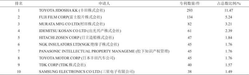 表1列出了固態(tài)電解質(zhì)領(lǐng)域?qū)@暾垟?shù)量排在前十位的申請人,可以看到申請人全部為公司,其中9位申請人歸屬于日本,1位歸屬于韓國。日本豐田公司堅持的是硫化物固態(tài)電池技術(shù)路線,期于大幅度提升電池的離子電導(dǎo)率、安全性等性能指標(biāo),進(jìn)而實現(xiàn)固態(tài)電池的商業(yè)化應(yīng)用。豐田計劃在2020年東京奧運會上亮相一款固態(tài)電池電動汽車,并預(yù)計2025年左右實現(xiàn)此類電動汽車的大規(guī)模生產(chǎn)。日本富士膠片主營相機(jī)、膠片等業(yè)務(wù),近年來也致力于氧化物和硫化物固態(tài)電解質(zhì)的研發(fā)。日本村田則重點研究全固態(tài)電池構(gòu)造以及制造方法,兼顧開發(fā)固態(tài)電解質(zhì)。韓國研究固態(tài)電解質(zhì)的主要有三星、LG和現(xiàn)代汽車三家企業(yè),專利分布相對集中。韓國三星集團(tuán)以硫化物固態(tài)電解質(zhì)為研究方向,與LG和SK創(chuàng)新成立合作機(jī)構(gòu),共同研發(fā)固態(tài)電池。