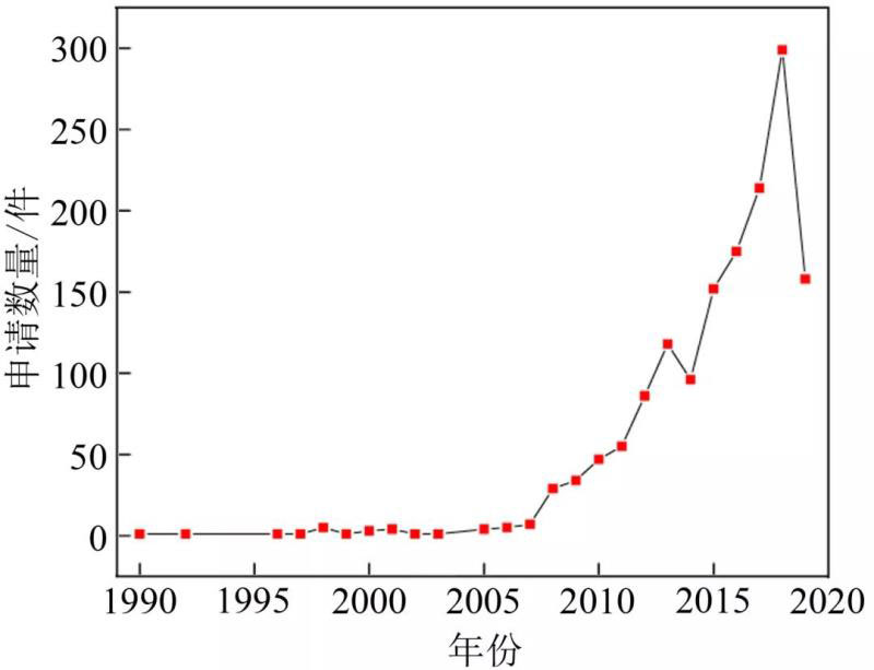 圖7為固態(tài)電解質(zhì)相關(guān)專利申請數(shù)量隨年份變化的折線圖,由圖可以看出三個發(fā)展階段:1990—2007年,每一年的申請專利數(shù)量都小于10件、變化較緩慢,這表明該時期領(lǐng)域發(fā)展停滯;2008—2014年,專利申請數(shù)量出現(xiàn)增長,表明該時期領(lǐng)域逐漸發(fā)展;2015年以后,專利申請數(shù)量開始大幅度增長,這表明全固態(tài)鋰電池的固態(tài)電解質(zhì)研究逐漸成為研發(fā)重點,得到各國研究人員的重視。