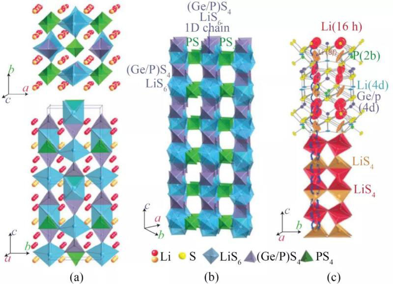 圖6 Li10GeP2S12中(a) 骨架結(jié)構(gòu)和參與離子傳導(dǎo)的鋰離子;(b) 框架結(jié)構(gòu);(c) 鋰離子的傳導(dǎo)途徑