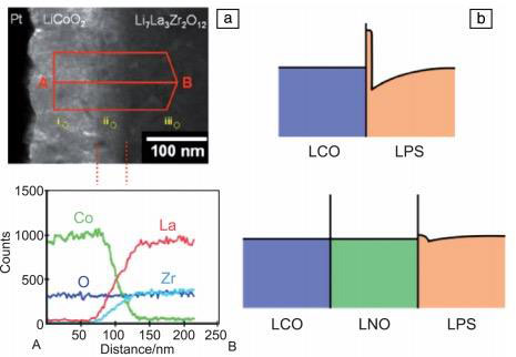 正極材料間元素的相互擴(kuò)散通常發(fā)生在氧化物陶瓷固態(tài)電解質(zhì)和氧化物正極材料之間的界面上。Kim等利用TEM和線性EDS發(fā)現(xiàn)LLZO與LCO的界面在室溫下存在50~100nm的元素擴(kuò)散層,如圖1a所示,其主要成分為La2CoO4。但是,由于在室溫下正極材料間元素相互擴(kuò)散的速度極慢,所以很難對該擴(kuò)散過程生成的產(chǎn)物進(jìn)行表征。