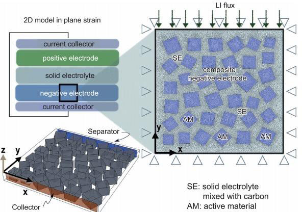 圖3 正極材料有限元模型的幾何、離散化和邊界條件示意圖。電極材料顆粒嵌入了固態(tài)電解質(zhì)和電子導(dǎo)電劑顆粒中