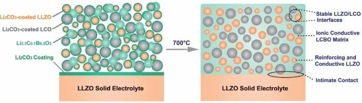 在正極材料中混入低熔點(diǎn)離子導(dǎo)體,通過施加高于 離子導(dǎo)體熔點(diǎn)的溫度使離子導(dǎo)體融化后冷卻,均勻分布在正極材料與固態(tài)電解質(zhì)之間,這種方法不僅可以避免正極材料與固態(tài)電解質(zhì)接觸發(fā)生反應(yīng)。而且可以提高正極材料與固態(tài)電解質(zhì)之間的接觸面積, 還能改善因正極顆粒在充放電時發(fā)生破碎而導(dǎo)致的接觸不良的問題。Han等在LCO和 LLZO界面處加入低熔點(diǎn)的LCBO,如圖6所示。LCBO使LCO與固態(tài)電解質(zhì)的接觸面積增大,同時減小了LCO在充放電過程中因體積變化導(dǎo)致的顆粒破碎對正極材料與導(dǎo)電劑之間接觸性能的影響。另外,利用LCBO隔絕LCO與LLZO,避免了兩者之間在充放電過程中發(fā)生反應(yīng)。3方面共同作用,提升了LCO/LLZO/Li全固態(tài)鋰離子電池的電化學(xué)性能,然而,該方法的制備工藝非常復(fù)雜,成本較高。