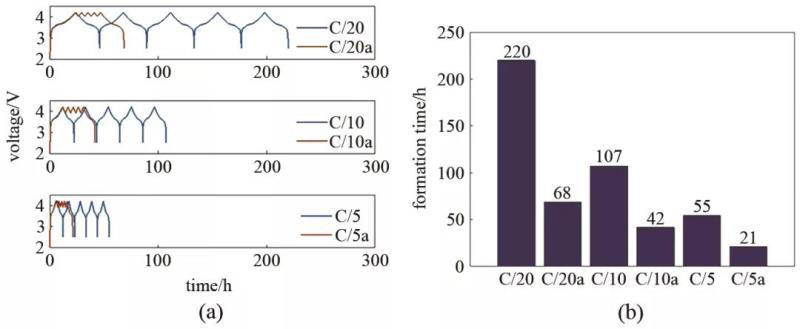 圖5 (a) 電壓曲線:藍色線表示基本的化成方法,橙色線表示3種新型化成方法(倍率標注a);(b) 不同化成方法對應(yīng)的化成時間