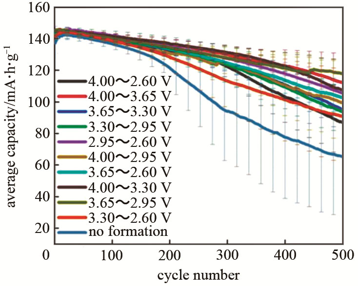 化成過程中除了電流能影響SEI膜的形成,電壓范圍的選擇同樣非常重要。優(yōu)化電壓區(qū)間可以降低電池容量衰退和節(jié)省化成時間。Lee等認為傳統(tǒng)化成過程消耗大量時間在SEI膜形成后的石墨嵌鋰過程中,因此對LiCoO2/C圓柱電池探究了不同的充電截止電壓對電池性能的影響。發(fā)現(xiàn)當充電截止電壓為3.6 V時,由于SEI膜沒有充分形成導(dǎo)致較差的循環(huán)性能;而當充電截止電壓為3.7 V的時候,SEI膜已完全形成,如果再增加截止電壓并不會再提升電池電化學(xué)性能。因此,3.7 V對LiCoO2/C電池是最合適的充電截止電壓。同樣地,與4.2 V的化成充電截止電壓相比,NMC/石墨或Li/NMC電池充至3.6 V或3.7 V(50% SOC)時,隨后的滿電循環(huán)過程中容量差別也并不明顯。Pathan等利用NMC111/石墨扣式電池在25 ℃溫度下對不同化成電壓區(qū)間進行探究。通過在2.6~4.0 V之間取10個不同的電壓區(qū)間充放電10次,隨后在2.5~4.2 V的電壓區(qū)間利用0.5 C倍率進行500次充放電循環(huán),結(jié)果如圖4所示。最好的電池性能對應(yīng)的是3.65~4.0 V之間的化成電壓,500次循環(huán)后容量保持率為86%。多種表征方式證明在3.65~4.0 V電壓區(qū)間化成形成阻抗更小的SEI膜。說明化成電壓區(qū)間的選擇對電池的循環(huán)性能非常重要,特別當電壓窗口在高電壓(>3.65 V)時,電解液更容易在正負極表面形成穩(wěn)定的SEI膜。