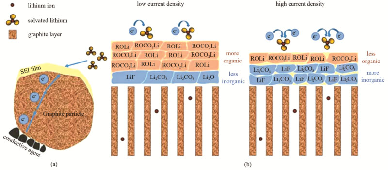 圖3 (a) 化成階段石墨表面SEI膜的形成和(b) 化成電流密度對SEI膜的影響